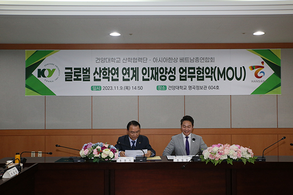 건양대학교(총장 김용하) 산학협력단(단장 홍영기)과 아시아한상 베트남총연합회(회장 김정민)가 9일 오후 건양대 창의융합캠퍼스 명곡정보관에서 글로벌 우수인재양성과 공동관심분야 협력체계 구축을 위한 산학연 업무협약을 체결했다.