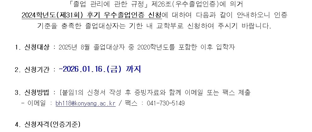 | 제목 | 2025학년도(제32회) 전기 졸업대상자 우수졸업인증 신청 안내 | ||||