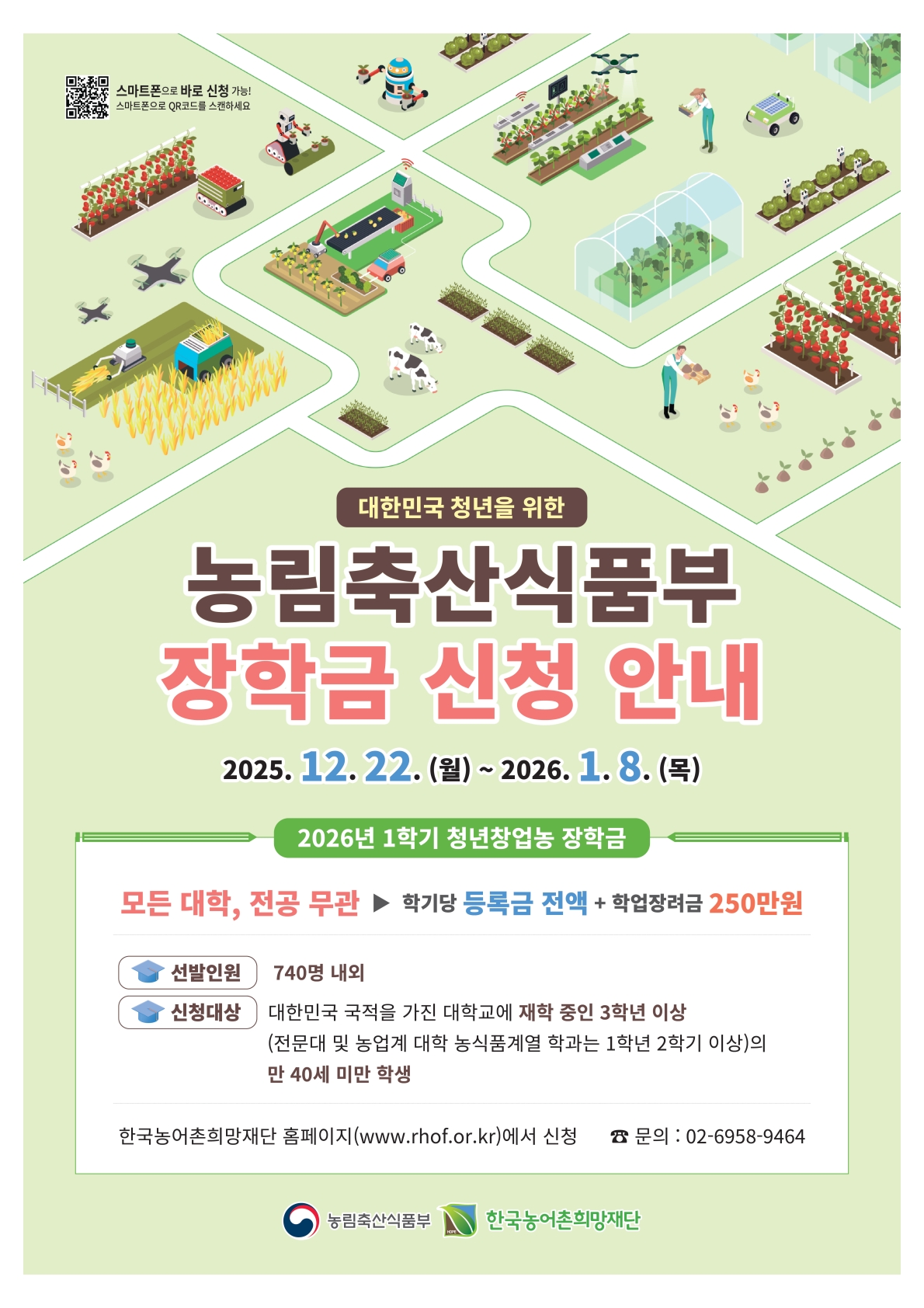 [ 지원대상 ] ○ 대한민국 국적자로서 국내 대학 재학생 ○ 일반대 전공무관 3학년~4학년 ○ 만 40세 미만 ○ 직전학기 성적(백분위 점수) 70점 (1.88) 이상, 12학점 이수 [ 지원금액 ] ○ 매학기 등록금 전액 + 학업장려금 250만원 [ 지원조건 ] ○ 졸업 후, 농림축산식품산업분야에서 장학금 수혜 기간만큼 취업. 창업 [ 신청방법 ] 2025.12.22.(월)~2026.1.8.(목). / 18일간 [ 관련문의 ] 농식품부 장학사업팀, 02-6958-9464 대한민국 농업의 미래를 이끌어갈 청년을 위한