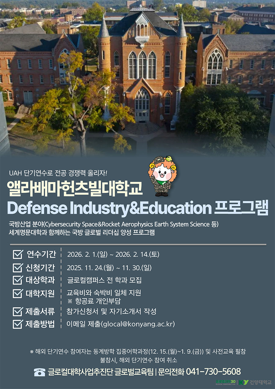| 제목 | (추가모집)2025학년도 앨라배마헌츠빌대학교 Defense Industry&Education 프로그램 모집 | ||||