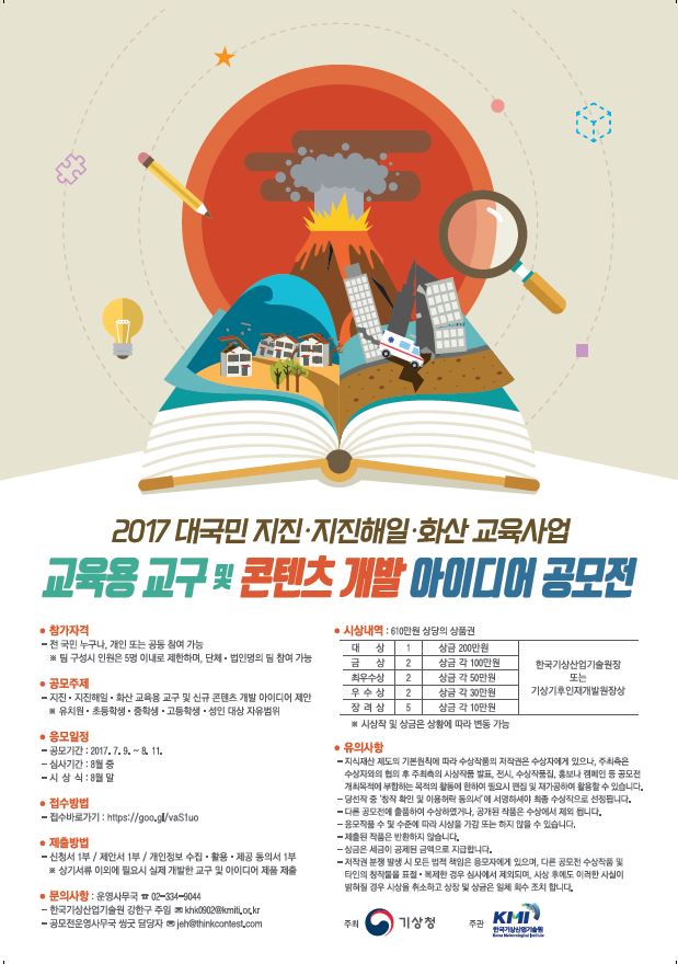 | 제목 | 2017 대국민 지진,지진해일,화산 교육사업 교육용 교구 및 콘텐츠 개발 아이디어 공모전 안내 | ||||