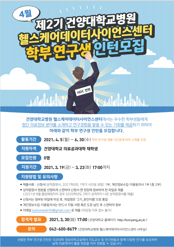| 제목 | 제2기 건양대학교병원 헬스케어데이터사이언스센터 학부연구생 인턴모집 | ||||