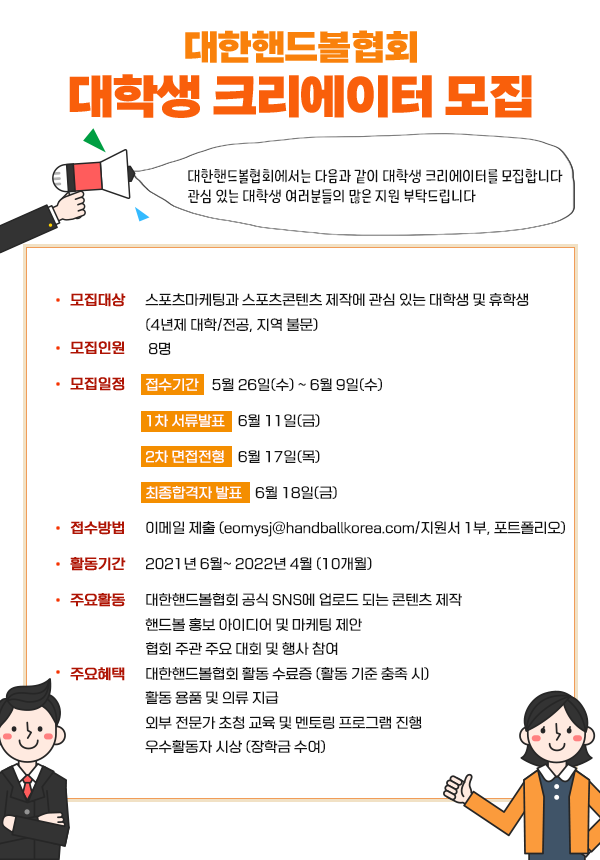 | 제목 | 대한핸드볼협회 대학생 크리에이터 모집 안내 | ||||