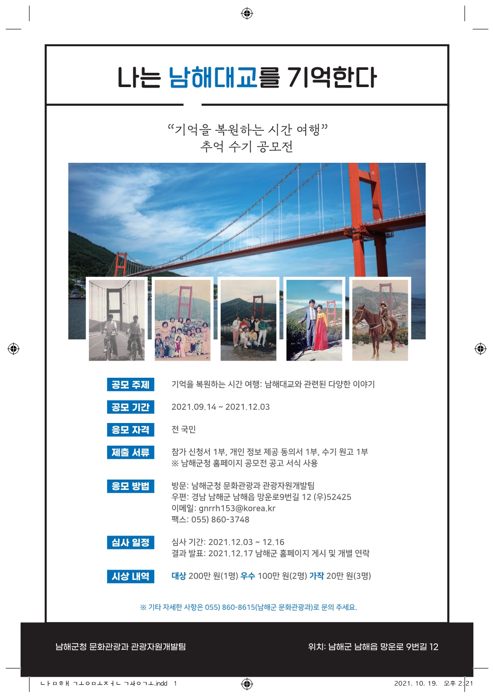 | 제목 | 「나는 남해대교를 기억한다 – 추억 수기 공모전」 안내 | ||||