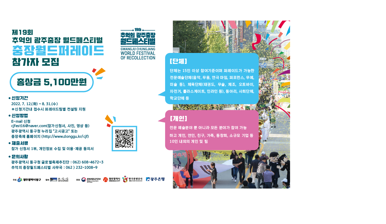 | 제목 | 제19회 추억의 광주충장 월드페스티벌 「충장 월드퍼레이드」 경연대회 안내 | ||||