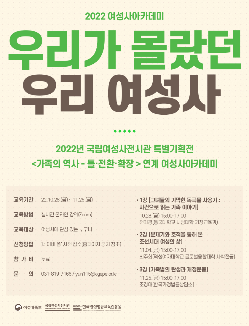 | 제목 | 2022 국립여성사전시관 '여성사아카데미' 참여 모집 안내 | ||||