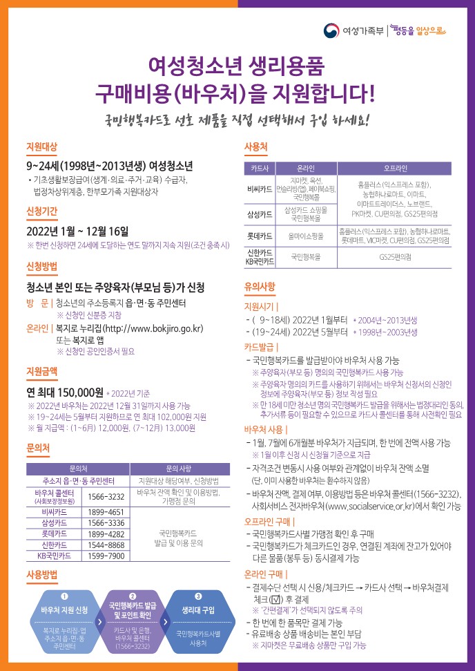 | 제목 | 여성청소년 보건위생(생리)용품 바우처 홍보 안내 | ||||