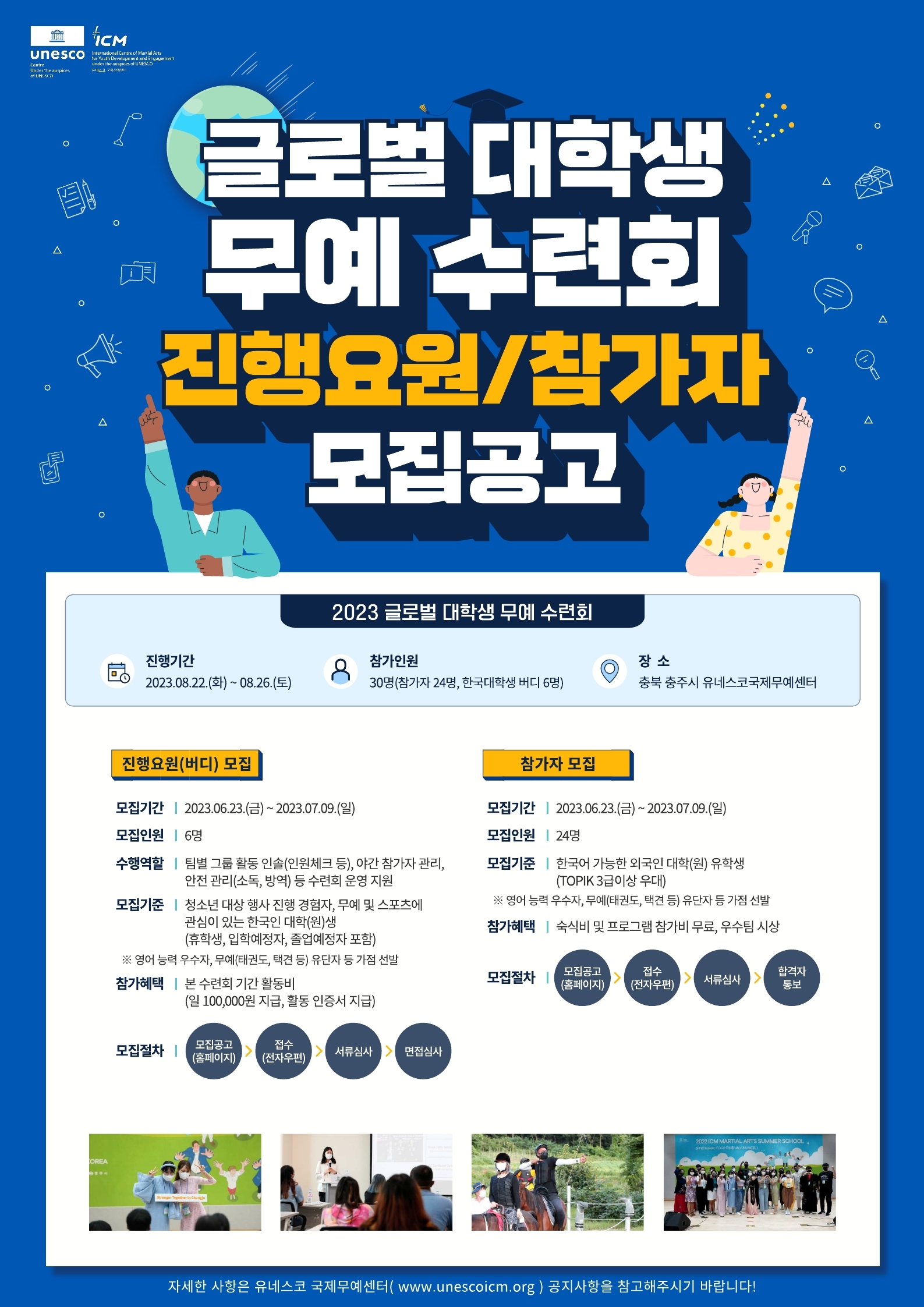 | 제목 | 「2023 글로벌 대학생 무예 수련회」진행요원(버디) 및 참가자(유학생) 모집 안내 | ||||