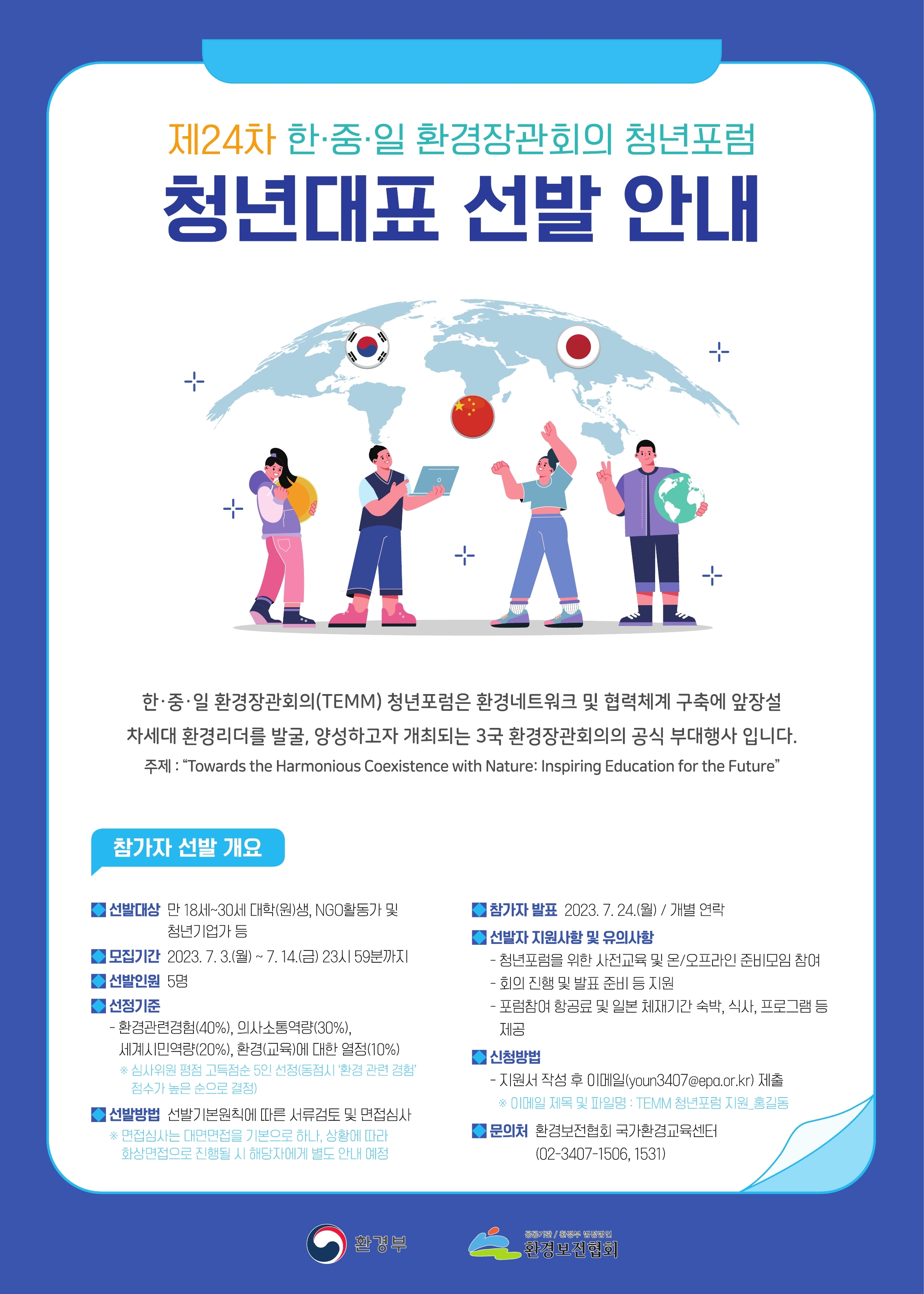 | 제목 | 「제24차 한·중·일 환경장관회의(TEMM) 청년포럼」청년대표 모집 안내 | ||||