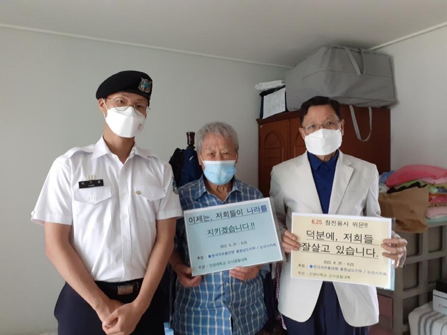 건양대 군사경찰대학, 6.25 72주년 맞아 참전용사 위문 건양대학교(총장 이철성) 군사경찰대학(학장 윤형호) 교수 및 학생들이 6.25 전쟁 발발 72주년을 맞아 지난 25일 6.25 전쟁 참전용사를 방문해 감사의 뜻을 전하는 시간을 가졌다. 이번 참전용사 방문은 한국자유총연맹 충남도지부와 논산지회 지원으로 이루어졌으며 건양대 군사학과 교수 3명과 재학생 6명이 각각 논산시에 거주하는 임건교 씨(84세), 최상기 씨(89세), 계룡시에 거주하는 이순혁 씨(92세) 자택을 방문해 미리 준비한 감사편지와 소정의 위문금을 전달했다. 이번 참전용사 방문에 참가한 건양대 군사학과 박기열 학생은 “오늘날 우리가 누리고 있는 자유는 그냥 얻어진 것이 아니라 나라가 어려움에 처했을 때 참전용사와 같은 분들이 자신의 몸을 아끼지 않고 지켜온 덕분이라는 점을 다시 한번 되새기게 됐다”며 앞으로 훌륭한 장교가 되어 나라를 지키는데 최선을 다하겠다고 밝혔다. 이날 학생들을 만난 참전용사 이순혁 씨는 “매년 이렇게 찾아주니 조국을 위해 6.25전쟁에 참여했던 한 사람으로서 너무도 감사하다”며 “최근 우크라이나 전쟁과 북한의 미사일 발사 등 더욱 불안해지는 세계 정세에 있어 튼튼한 안보가 뒷받침되지 않으면 또다시 어려움에 처할 수 있다는 사실을 잊지 않았으면 좋겠다. 미래의 대한민국을 이끌어갈 학생들이 나라의 소중함을 다시 한 번 되새기고 더욱 최선을 다해달라”고 당부했다.