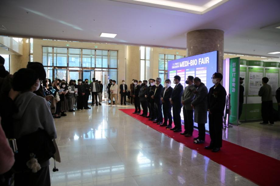 메디바이오페어 개막식은 18일 오후 죽헌정보관 로비에서 우수졸업작품 및 캡스톤 디자인 우수작품, 산학협렵 포럼 등의 성과물이 전시된 가운데 김용하 총장, 허용도 부총장, 오도창 산학협력부총장, 홍영기 산학협력단장, 조용석 공학교육혁신센터장 및 학과장, 주요 보직자들과 함께 의료공과대학 재학생 200여명이 참석해 열렸다.