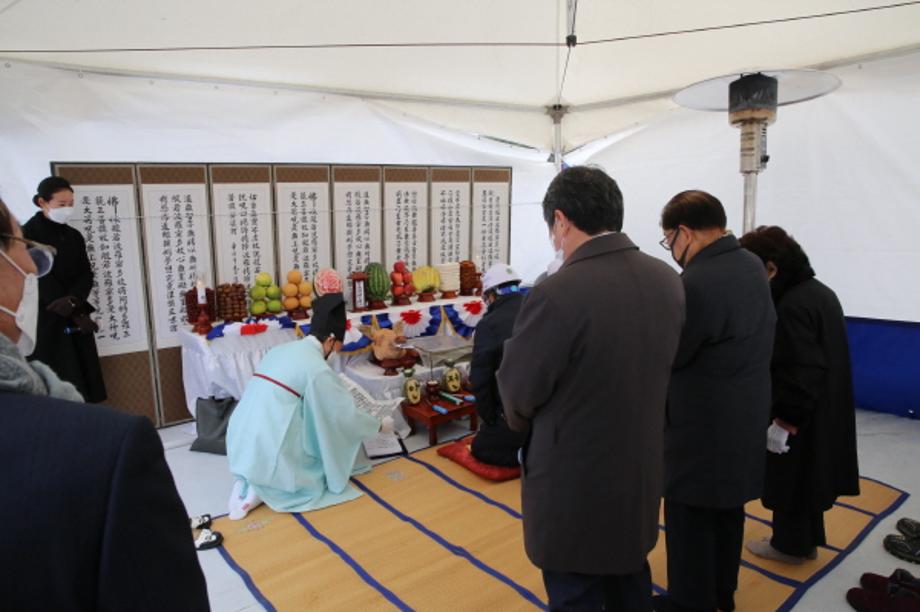 22일 열린 건양대 의과학대학 및 건양사이버대학 교사 신축 착공식에서 김희수 명예총장과 김영이 사모, 김용하 건양대 총장이 안전기원제를 드리는 모습.JPG