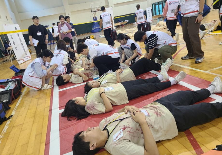 건양대 응급구조학과, 2024년 재난응급의료 비상대응매뉴얼 교육 지원 건양대학교(총장 김용하) 응급구조학과(학과장 박정희) 학생들이 21일 천안 재능교육연수원에서 국립중앙의료원 중앙응급의료센터가 주최한 ‘2024년 재난응급의료 비상대응매뉴얼 교육’에 모의 환자 역할로 참여했다. 이날 시행된 ‘2024년 재난응급의료 비상대응매뉴얼 교육’은 전국 권역응급의료센터 및 소방, 보건소 재난지원 의료 인력의 현장 대응 능력 향상을 위한 교육으로 가상의 현장 상황을 설정한 시나리오 기반 종합훈련으로 진행됐다. 이날 훈련에 참여한 응급구조학과 학생들은 재난 현장에서 현장응급의료소의 운영과 소방·보건소·권역응급의료센터 재난의료 대응팀들의 응급활동에 대한 모의 환자로 교육에 참여했다. 건양대 응급구조학과 박정희 학과장은 “이번 재난응급의료 비상대응매뉴얼 교육 지원 협조 요청을 해준 중앙응급의료센터에 깊이 감사드린다”며 “오늘 재난응급의료 비상대응매뉴얼 교육 참여를 통해 귀중한 경험을 한 학생들이 미래를 선도하는 역량 있는 현장 응급의료 전문가로 성장할 것이라 믿는다”고 밝혔다. 이날 교육에 참여한 학생들은 “재난 발생 시 인명피해를 최소화하기 위한 현장응급의료소의 운영과 119구급대원, 보건소 신속대응반, 권역응급의료센터 재난의료지원팀의 역할과 활동을 직접 경험하는 소중한 계기였다”고 말했다. |