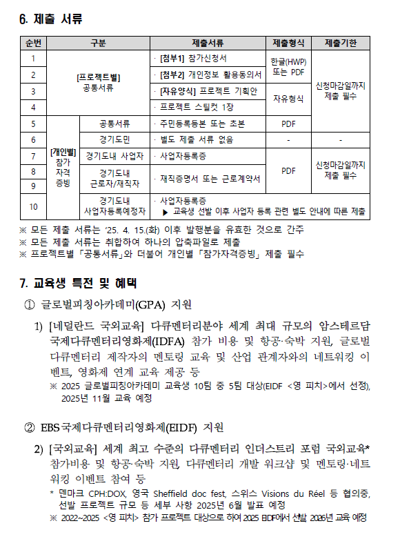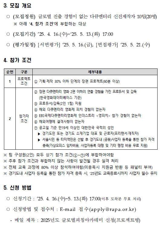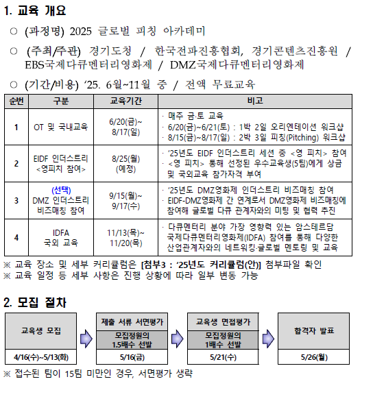 모집기간 : '25. 4. 16.(수)~5. 13.(화) 17:00까지 모집대상 : 다큐멘터리 신진제작자 10팀(20명) 등(경기도민) 교육기간 : ‘25. 6월~11월 중 신청방법 :이메일 제출, 글로벌피칭아카데미 홈페이지(gpadoc.kr) 2025년도 <글로벌 피칭 아카데미> 교육생 모집 공고 참고