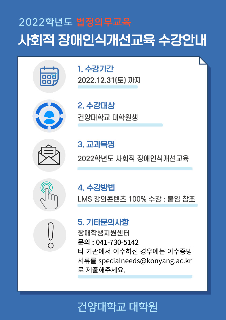 | 제목 | 2022학년도 대학원 장애인식 개선 교육 수강 안내 | ||||