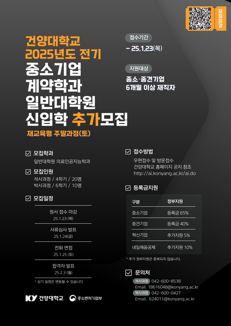 | 제목 | 2025학년도 전기(봄학기) 건양대학교 일반대학원 의료인공지능학과 추가 모집(중소기업계약학과 전형) | ||||