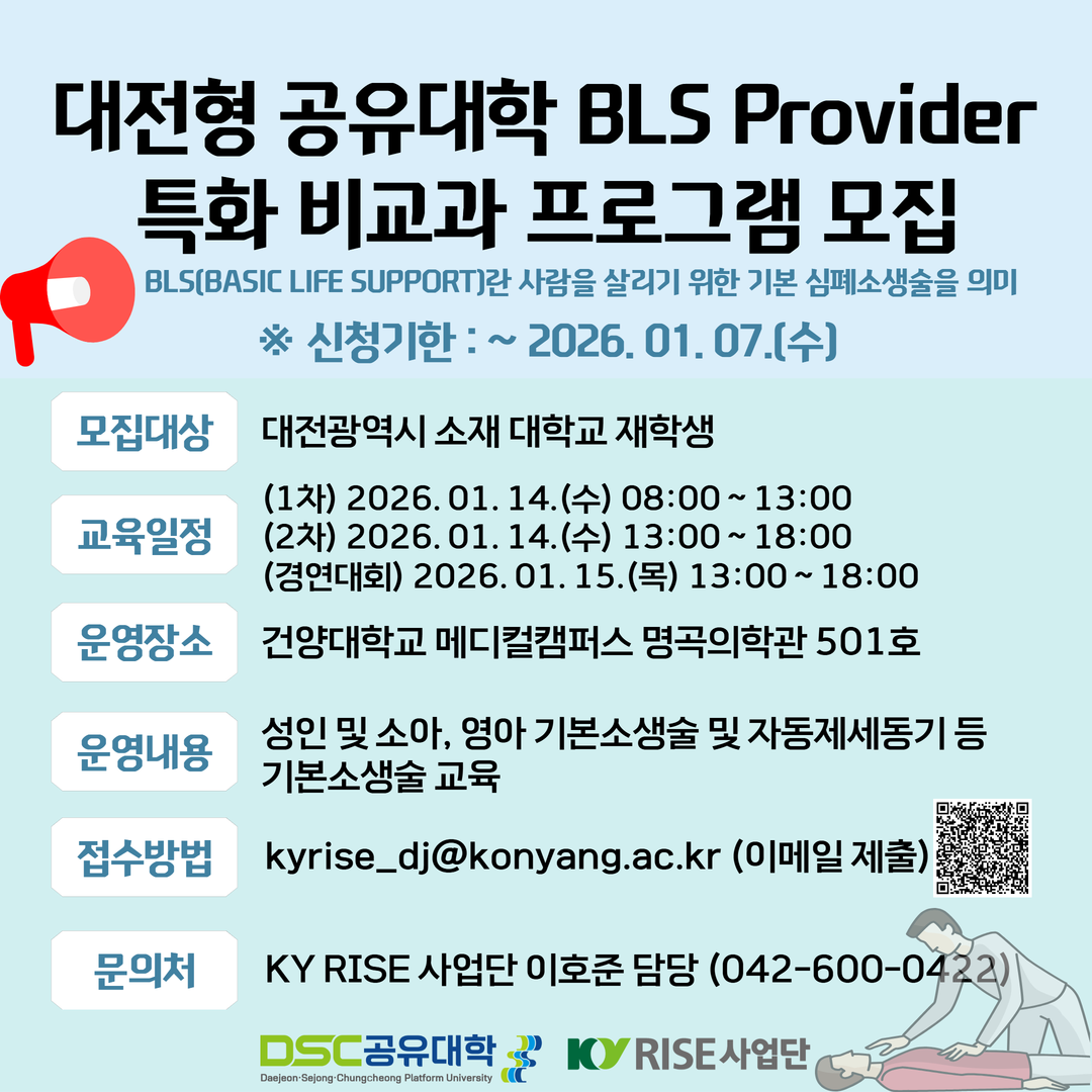 『 대전형 공유대학 BLS Provide 특화 비교과 프로그램 모집 안내 』글의 상세내용을 확인하는 표로 제목, 부서명, 등록일, 조회, 첨부, 내용으로 나뉘어 설명합니다.